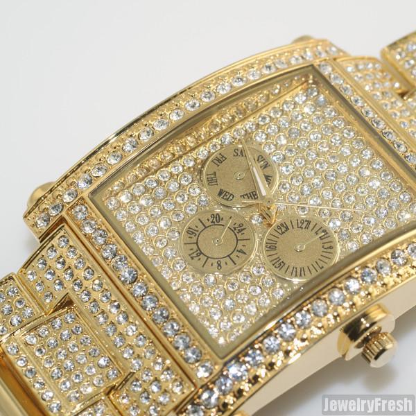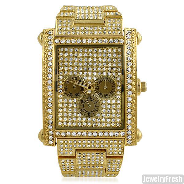 Gold Fully Iced Rectangle Face Czech Crystal Watch