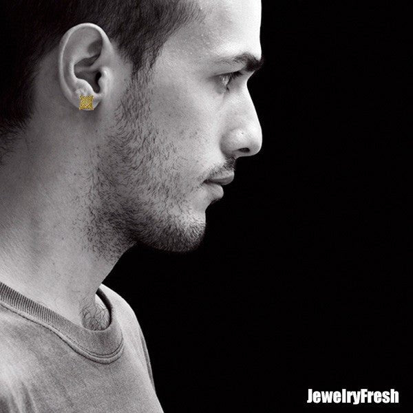These earrings are made out of solid brass with a thick coat of black, white or yellow gold. There are breathing holes for every stone just like on high end diamond jewelry. These earrings are unisex and sold by the pair (2pcs).