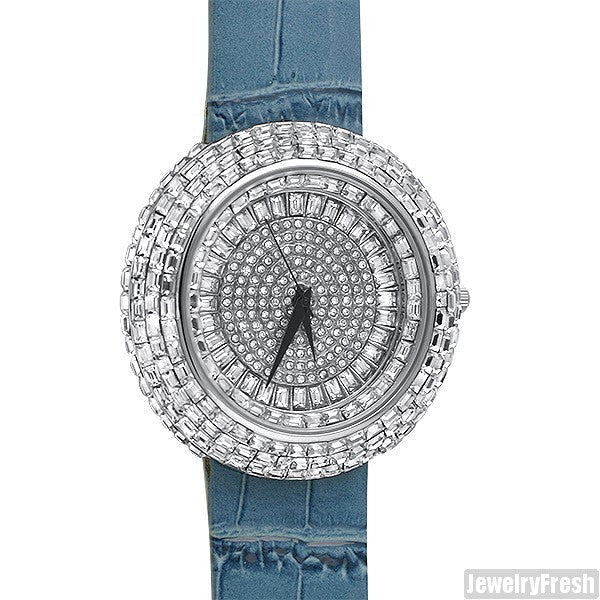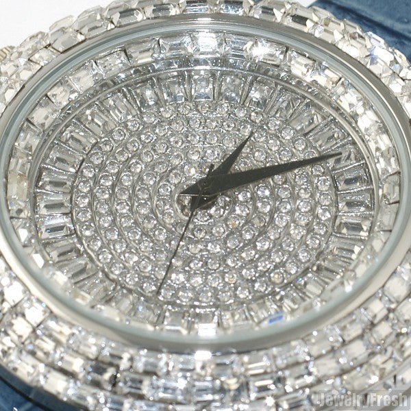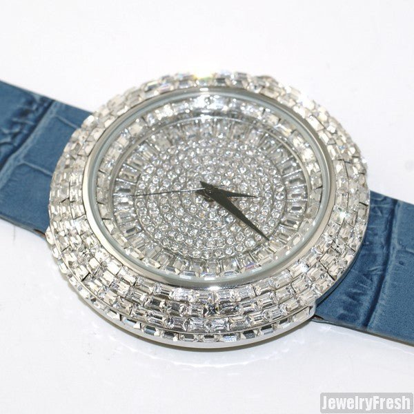 Introducing the legendary Ice Orbit watch. This watch is fully flooded with genuine Czech crystals (not cheap rhinestones) in baguette and round cut. The entire inner and outer dial is covered with stones, as well as a 4 row baguette bezel. This watch is incredible in person and the shine is beyond anything else out there. It is made out of alloy metal with a reliable Japanese quartz movement. It is custom made, not found in stores. It comes in with a blue patent leather gator pattern strap.