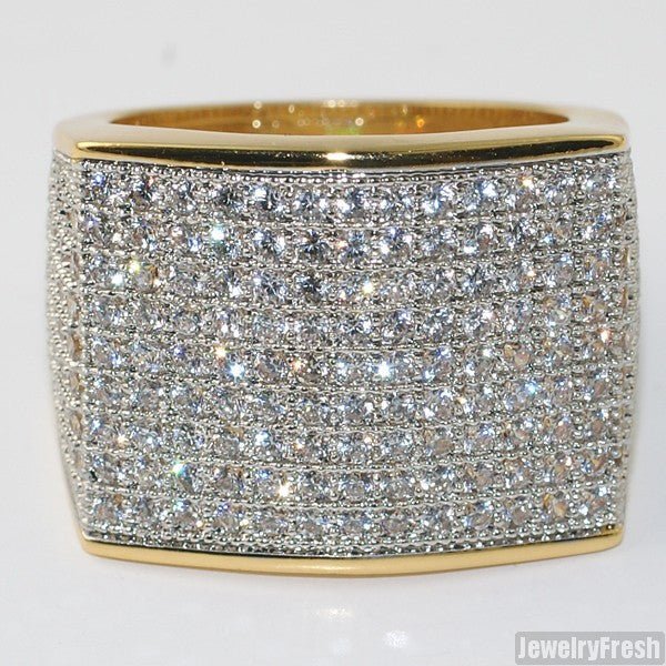 This ring is made out of solid brass and features thick plating with clear coat. All stones are lab made VVS Flawless simulated diamonds. Each stone is micropave prong set by hand with breathing holes for maximum shine. Order yours today!