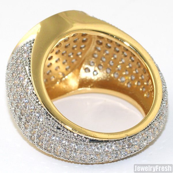 This ring is made out of solid brass and features thick plating with clear coat. All stones are lab made VVS Flawless simulated diamonds. Each stone is micropave prong set by hand with breathing holes for maximum shine. Order yours today!