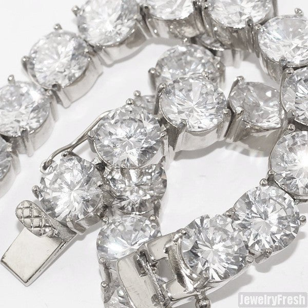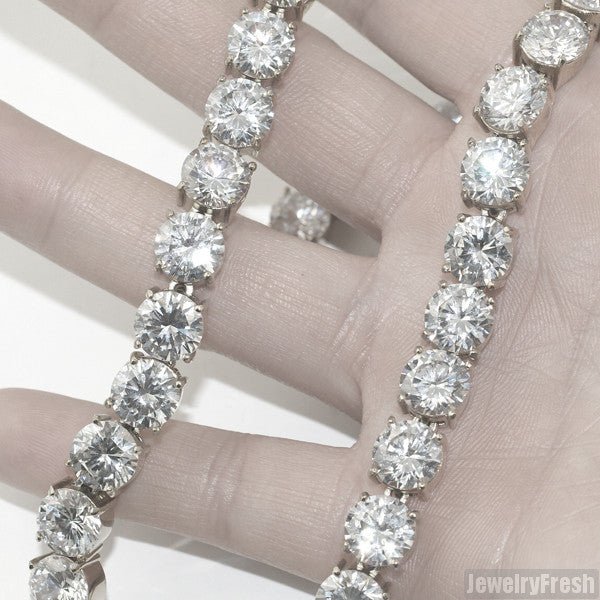 This stunning chain is made with flawless top quality VVS flawless lab made diamonds. Each stone is 10mm (3.8 carats). It has the look and shine of genuine diamonds at an affordable price. Each stone is prong set on a heavy stainless steel setting. This chain will never fade or tarnish. Order yours today!