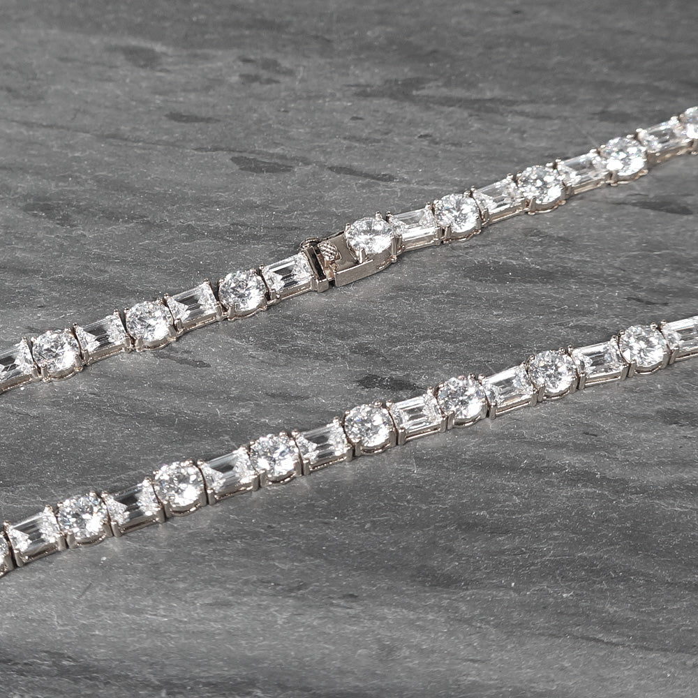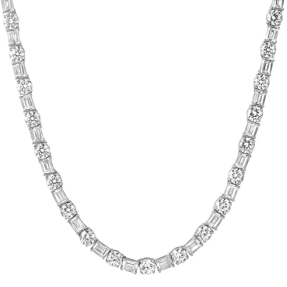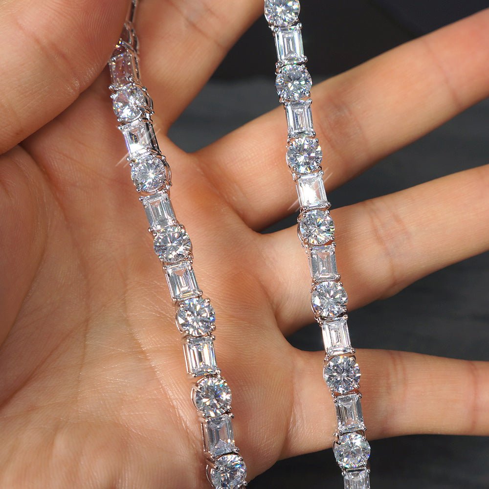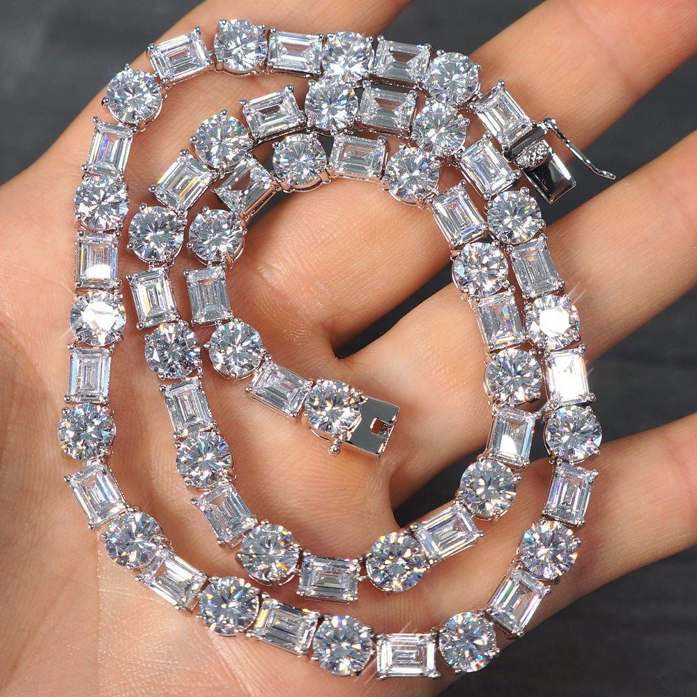 Officially the hardest shining tennis chain made. This is celebrity level bling. Get stares and compliments all day with this luxury tennis chain. Every other link is a full 1 carat emerald and 1.30 carat round simulated diamond, both with the exact same cut and polish techniques used on natural diamonds. Each stone is VVS+ clarity, giving you the pure water flawless look with amazing fire and brilliance. No picture or video can replicate the stunning shine that you'll see in person. Order yours today and rock it in just a few days!