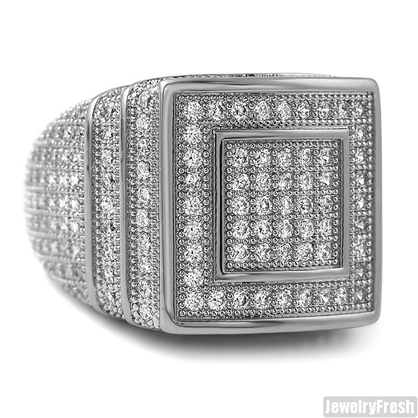 This ring is made out of solid brass and features thick plating with clear coat. All stones are micropave prong set by hand. All stones have breathing holes for maximum shine. Order yours today!
