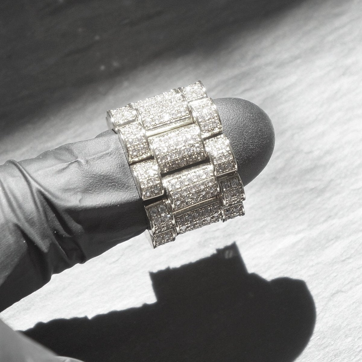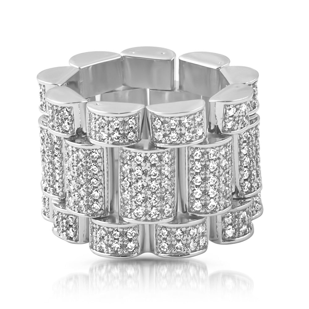 This unique ring is made just like a presidential watch band. Every link bends and moves like a watch band. It is fully encrusted with top quality European machine cut simulated diamonds. Every stone is prong set by hand. Order yours today!
