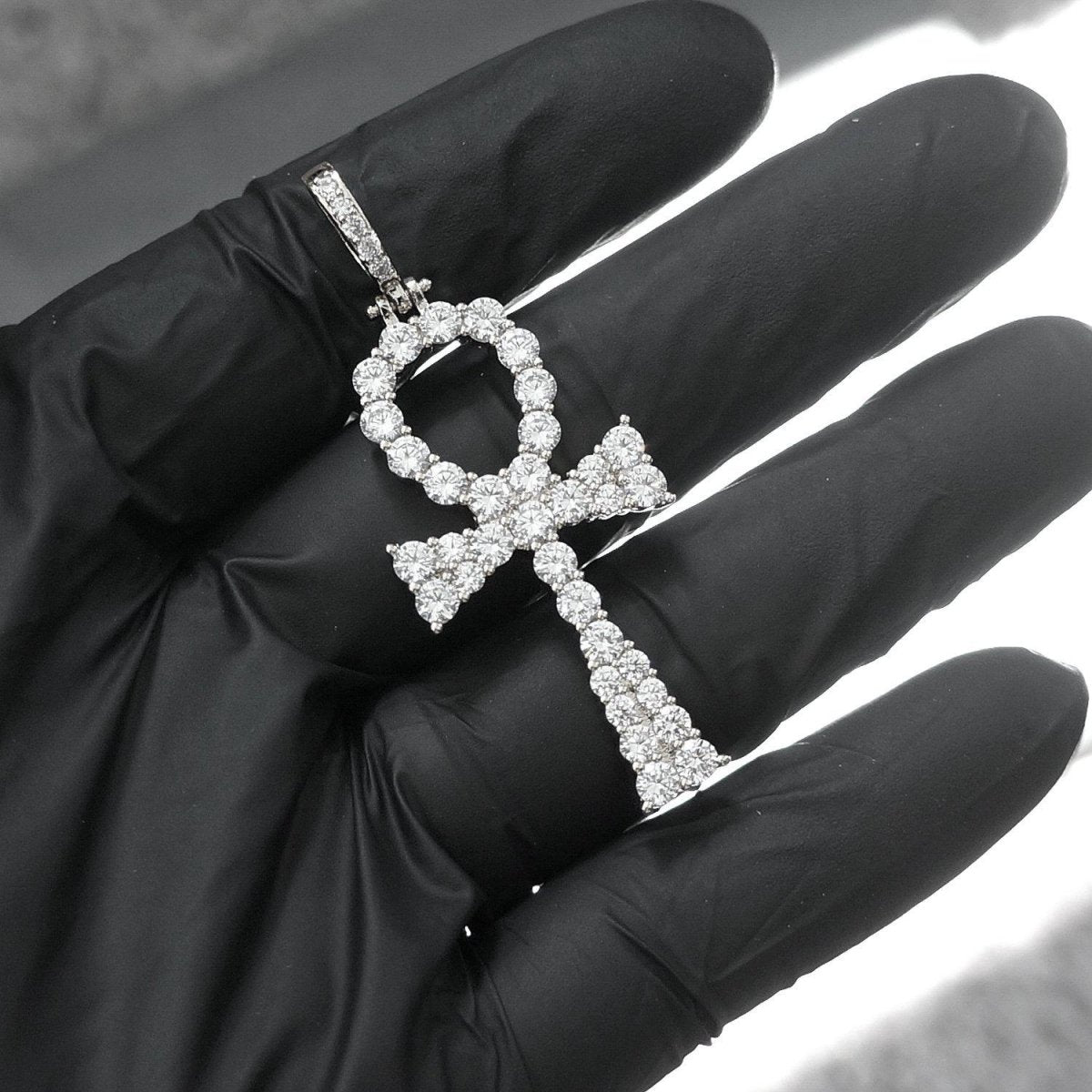 This unique ankh pendant is made up of solitaire stones each prong set onto the pendant. These amazing lab made stones have the exact same cut and polish as genuine diamonds, giving them the identical sparkle and fire. Wear this with a 2 or 3mm tennis chain for a fully iced look or up to a 5mm plain chain for a more low key shine. Get yours today!