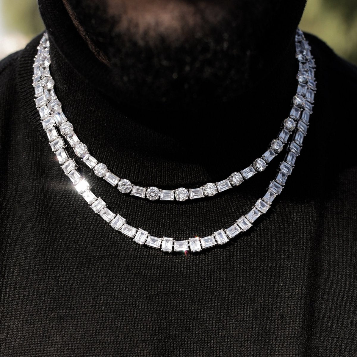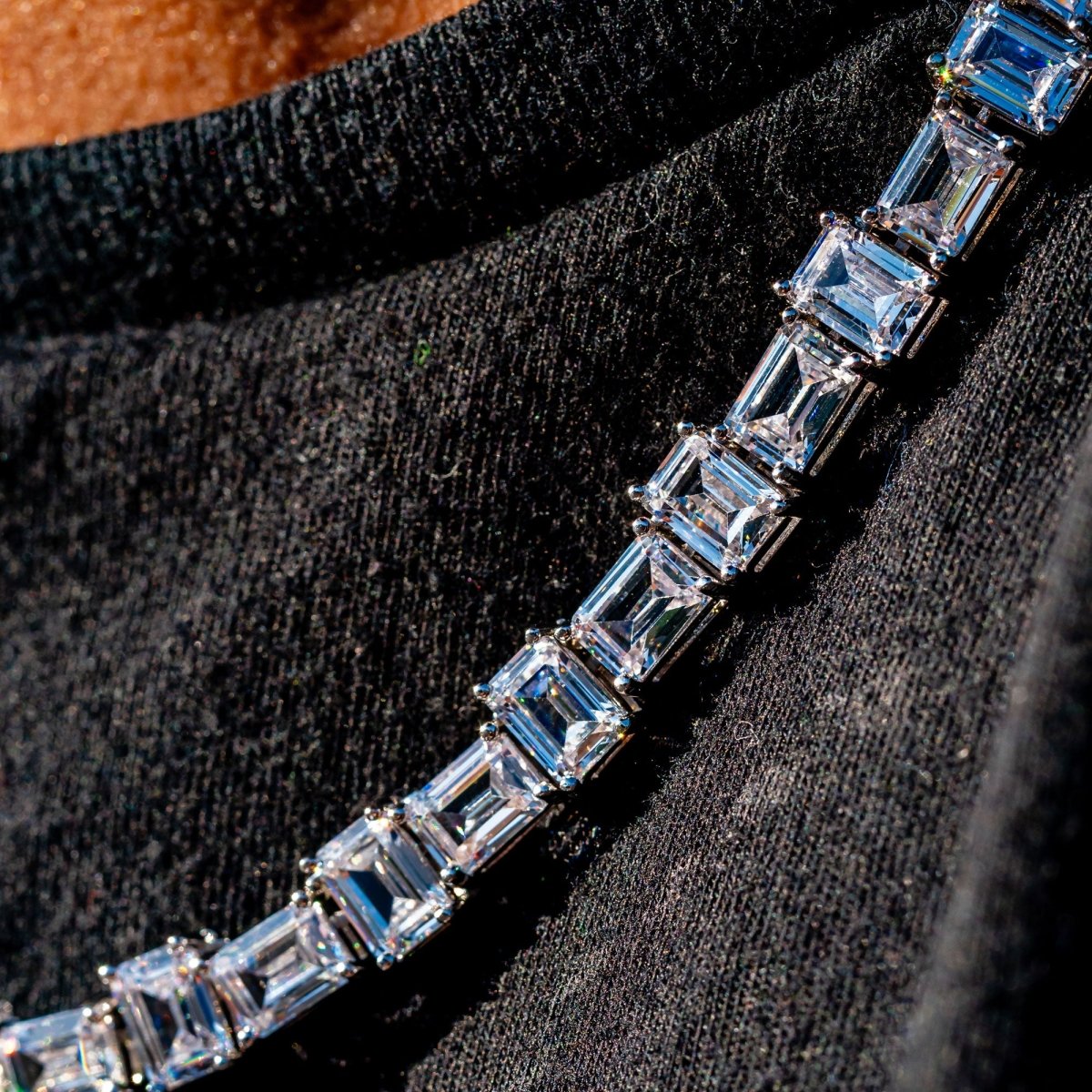 It hit different! This is celebrity level bling. Get stares and compliments all day with this JF exclusive unique exotic cut tennis chain. Every single link is a full 1 carat emerald cut simulated diamond, with the exact same cut and polish as natural diamonds. Each prong set stone is VVS+ clarity, giving you the pure water flawless look. Nothing like this is out there. Get the 5 figure look at an affordable price. Order yours today and rock it in just a few days!